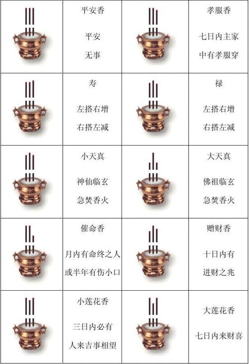 具体的公式有很多公式,有很多名字和方法。这里只能讲一些简单易懂的知识。看香大致分为七个要点,用这七个要点的搭配来区分吉凶。一、燃香;(点香时起火为吉,无火,冒黑烟为凶。)二、收火;(香放在香炉里,火不会立即熄灭成吉兆,时间越长熄灭越好)三、火花;(一般指灵光香,火花溅得极其明亮,啪啪作响作为吉兆)四、明暗;(香火柔和明亮,主吉是黑暗的,主凶是黑暗的,主事是多变的。)五、香烟;(香烟直接冲向云天作为祭坛,香烟盘旋主阴人有冤情。)六、香灰;分为黑白(白吉黑凶)直(向外弯曲为泄财,向内弯曲为采福)搭桥(比较复杂,这里就不说了)(香灰经常落主吉,香灰顶盖不吉利,顶盖长于一寸以上。)七、参差平齐;(详见民间四十二香谱)论香扎;(指5.7.9.把香放在一起)首先结合七个要点看。如果香火旺,运气会很好。香灰外弯像莲花,内弯像耦合。都是主吉,内弯外弯参差不齐,主不好。中间有一柱顶盖,主要危险。注意;由于香的质量不同,看香首先要看香的质量再看香的诀窍,千万不要把现实的因素归因于神佛的喜怒。还有几个杂点;火断了;(点香的时候点燃后熄灭,除了受潮的因素,主要是鬼鬼祟祟的纠缠活堂上的东西);(点香的时候香,放好后香,主阴人扔香或者鬼鬼祟祟的骚扰。)看香的方法二。看香的方法有很多种,根据香堂的性质,时间、仙家的喜好等原因并不完全相同。这里有一些看香的方法和经验供注定的人学习。1.三种香味:灾难性的香味大多在点香时不能一次点。点燃后,香一般比较暗淡。在燃烧过程中,香灰会相互搭接,说明来人会有灾难。如果是中间的香灰,放在左边的香上,说明来人会有意外。如果中间的香灰搭在右边的香上,说明来人会有重大疾病。如果是左边的香,中间的香意味着来人的家人会有灾难。如果是右边的香,中间的香意味着来人的亲戚(或好朋友)会有灾难。若香在燃烧过程中熄灭。预示着死亡。香味熄灭了。中间代表来人,左边是他的家人,右边是他的亲戚(或好朋友)。香掐早,时间紧迫,捏晚,时间晚。用三根香看东西的时候,如果三根香的香灰都向外弯曲,90度以上才掉下来,可以证明来人家里有仙家要出马。根据弯曲时间推断,弯曲快,马上就要出马,弯曲慢,等一段时间出马。若香灰打卷,立即放弃,不要再看了,是别人的仙家道行远远大于你的仙家,继续看下去,可能对你不利。或者没有机会,在这里出不来。2.九根香:和三根香基本一样。灾难香多在点香时,一次点不到。点燃后,香一般比较暗淡。在燃烧过程中,香灰会相互搭接,这表明来人会有灾难。另外九根香的明显标志是香灰色暗淡直立,不愿意掉下来。香灰向中间倾斜意味着来人有困难。大多数香灰向左倾斜意味着来人的家庭有困难,大多数香灰向右倾斜意味着来人的亲戚(或好朋友)有困难。掐香和三香是一样的,中间代表来人,左边代表来人的家人,右边代表来人的亲戚(或好朋友)。事情发生的时间按掐香的早晚断。用九根香看事的时候,如果所有的香灰都倾斜到外面,说明对方有仙家要出马。如果有一种香味烧得很慢,明显突出在其他香味上,也就是说,有一种香味,单独留下来慢慢留下来,这就是仙女马上出来的意思。与其它香味相差越大,离马越近。如果所有的香灰都沿着一个方向倾斜,建议你不要继续看,和三根香一样。也就是说,对方仙家的道行远远超过你的仙家,或者与你无缘。你不能这样出来。简而言之,无论是三香还是九香,如果你发现香头,突然明暗,建议你不要看,这是为了提醒你,这个人将来会给你带来不必要的麻烦。还是回避吧。以上只是一个提示,具体要靠仙家仔细检查,才能知道最后的结果。