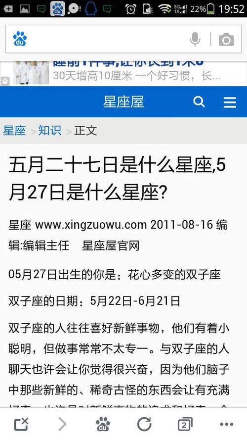 星座是由阳历日期决定的。这一天是阴历还是阳历?假如是阳历日期,5月27日是双子座,假如是阴历日期,就要说明年份,才能查询属于哪个星座。