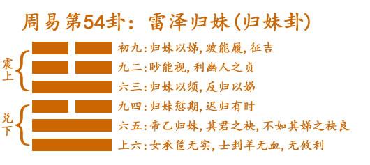 首先简要介绍雷泽归妹卦的基本信息。六个卦分别代表:初九是“震来则恐,丧车颠,见盖则\”、九二是“震来厉,亿丧质,不要用有往,得舆\”、九三是“震苏苏,震行无障碍”、六四是“焚烧既伤,以牺牲为代价,所以纯洁,井无毒”、九五是“王假之,不忧不忧,其邑之友,既克又\”、六是“拘系之,是从维之,王用亨于\”。