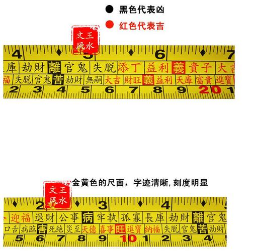 风水鲁班尺在风水界很流行。它从上至下共分四排,其分别是传统的寸、鲁班尺、丁兰尺、厘米四种标尺。这种风水尺在使用时非常方便,鲁班尺(俗称:阳宅尺)长约42.9厘米,相传为春秋鲁国公输班所作,后经风水界加入八个字,以丈量房宅吉凶,并呼之为“门公尺”。其八个字分别是:财、病、离、义、官、劫、害、本,在每一个字底下,又区分为四小字,来区分吉凶意义。其八个字及附带的小标格分别代表的吉凶含义附上如下供大家参考: