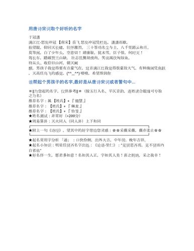 宋词是中国宋代流行的文学体裁。它是一种相对于古典诗歌而言的新体诗。它是宋代文人学者智慧的结晶,标志着宋代文学的最高成就。歌词和句子有长有短,很好唱。因为是合唱歌词,又叫歌词、乐府、乐章、长短句、诗词、乐趣等。始于南朝梁朝,形成于唐朝,兴盛于宋朝。宋词是中国古代文学皇冠上的璀璨明珠,是中国古代文学元朗中芬芳绚丽的花园。它以丰富多彩、多变的魅力与唐诗、元曲抗衡,一直被称为唐诗中最多的,代表着一代文学的繁荣。同名书《宋词》。以苏轼、辛弃疾、柳永、李清照为代表的宋词。宋词给一个男孩取名的寓意是,他学识渊博,温文尔雅,谈吐得体。宋词给男生起名字的印象是学历高,知识渊博。所以用宋词给男生取名有很好的寓意。