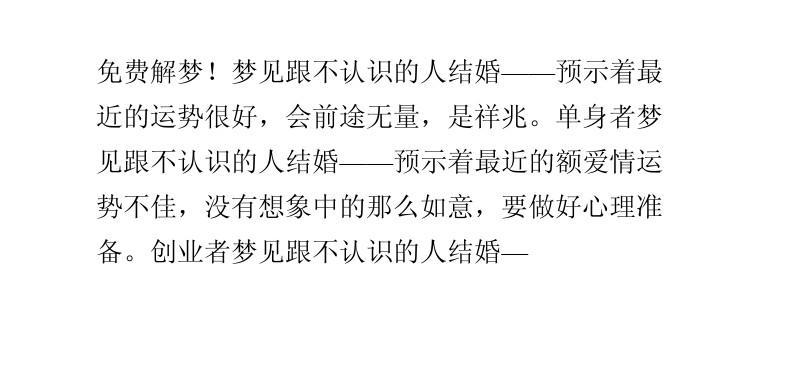 3、梦见我和一个不认识的人结婚是什么意思本命年的人梦见我和一个不认识的人结婚,意味着宜守不宜进、慎防先得后失,谦让得福。
