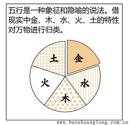五行是文化中的术语,指的是金、木、水、火、土这五种元素,它们之间构成一种相生相克的关系,互为制约,相互配合,统治着一切事物的变化。