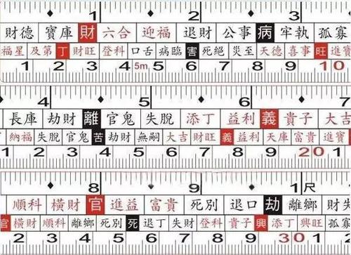 1、一寸(3.2厘米)为“财”;六寸(19.2厘米)为“义”,一尺六寸(51.2厘米)为“财”;两尺一寸(67.2厘米)为“义”,两尺八寸(89.6厘米)为“吉”;三尺六寸(115.2厘米)为“义”,五尺六寸(179.2厘米)为“吉”;七尺一寸(227.2厘米)为“吉”,七尺八寸(249.6厘米)为“义”;八尺八寸(281.6厘米)为“吉”,一尺一寸(323.2厘米)为“财”。
