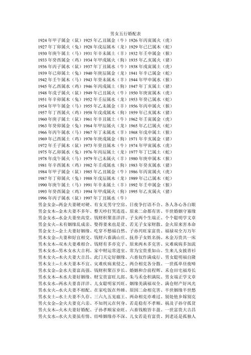 婚姻是生活中的一件大事,一个家庭的幸福与和谐,往往取决于夫妻之间的相互理解与般配。根据传统文化的理论思想,人类内部有五种元素,即水、木、火、土、金。五行相互生成,相互影响。如果五行相辅相成,可以增进夫妻关系。如果五行相辅相成,可能会影响夫妻关系。五行相生是指水生木、木生火、火生土、土生金、金生水;五行相克是指水克火、火克金、金克木、木克土、土克水。以下是五行婚姻表,供大家查询使用。