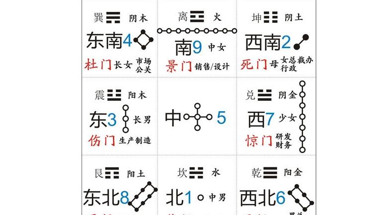 九宫:乾宫、坎宫、艮宫、震宫、中宫、巽宫、离宫、坤宫、兑宫。九宫格与五行的关系。