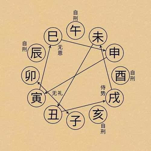 刑有几种形式,有三刑,也有自刑。比如:子(鼠)、卯(兔)相刑,为无礼之刑。寅(虎)、己(蛇)、申(猴)相刑,为恃势之刑。丑(牛)、未(羊)、戌(狗)相刑,为无恩之刑。