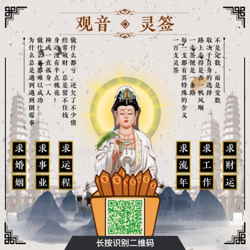 观音精神标志是传统佛教信仰中最受欢迎的祈祷方式之一。据说,精神标志是观音菩萨送给佛教信徒的礼物,帮助人们解决各种问题和困难。通过随机选择一个精神标志,人们可以得到观音菩萨的指导和帮助。观音精神标志反映了观音菩萨的同情心和智慧,可以让人们更深入地理解佛教思想,帮助人们解决生活中的实际问题。