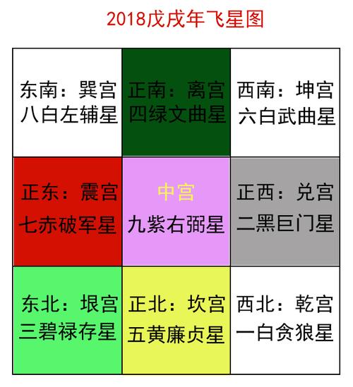 一颗白水星居坎宫,二颗黑土星居坤宫,三颗碧木星居震宫,四颗绿木星居淞宫,五颗黄土星居中宫,六颗白金星居乾宫,七颗红金星居兑宫,八颗白土星居艮宫,九颗紫火星居离宫。以上是九星原本居住的宫殿,但会随着年、月、日、时而不断变化。在九星中,紫色和白色是幸运的,蓝色、绿色、黄色和黑色是凶猛的。