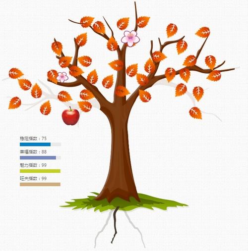叶色代表配偶或恋人在生活中的喜忌关系。红色和绿色是幸福的人。这是一棵健康的婚姻树。一般来说,配偶或恋人对自己有帮助,有积极影响,对自己有物质或精神上的帮助,或者在异性的帮助下事业成功、财富和生活受益。但如果叶尖变黑变灰,为由喜变忌,配偶反而会对自己帮助不大,甚至容易背叛自己,容易先好后坏,造成伤害。