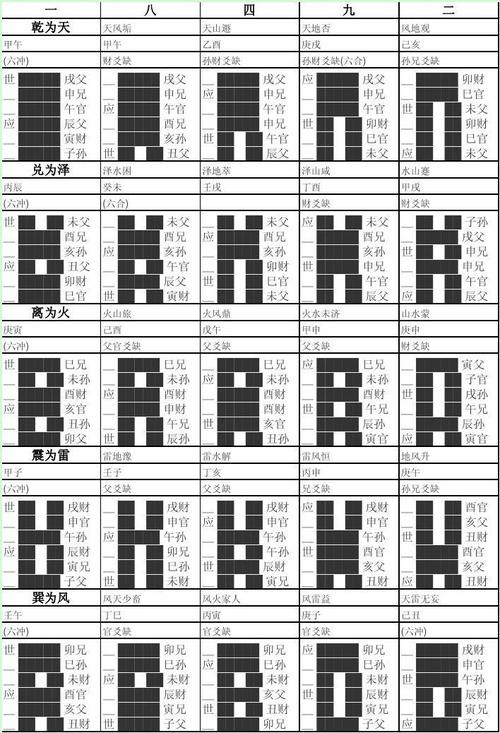 1、本卦,又叫主卦、原卦。它体现的是事物初始、开始阶段的信息,或目前的情况。代表的是目前的情况。2、互卦是由本卦的两个内卦组合而成的。具体组合方法是:本卦中的第三、四、五爻,拿出来作为互卦的上卦,本卦的第二、三、四爻,拿出来作为互卦的下卦。上卦、下卦组合在一起,就得到了互卦。互卦为事情发展的过程。3、变卦是由本卦经过某个爻的变动、变化而得到的,也就是变卦是由本卦变动而来的。变卦代表着事物发展变化的最终结果,也就是求测者想要得到的最终结果、结局。在预测时,事物的最终吉凶结果,要由变卦来作最后定夺。所以,预测最终要以变的结果为准。变卦为事情发展的结果。4、错卦是与本卦阴阳全颠倒的卦,即每个爻阴变阳、阳变阴而得到的卦。5、综卦就是把本卦倒过来看。它们通常是从事物的反面来看事物的发展变化。