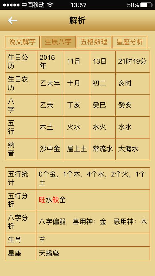怎么看生辰八字中五行缺什么首先,你要了解天干地支的五行属性