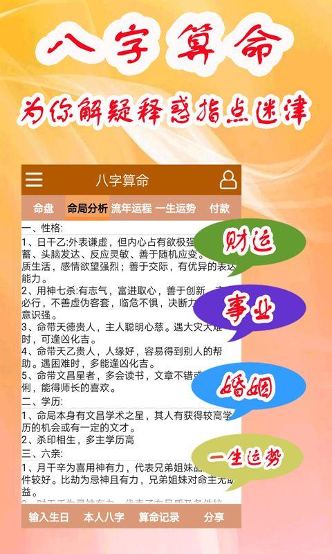 生日八字:由出生年、月、日、时组成的八个数字。这是排版命理学的基本条件和其他内容。