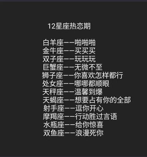 1、白羊座:白羊座是比较标准的行动派,既然心中有了喜欢的人,那么当然要让对方知道自己的心意,而且这时的他们会开始注意自己的形象,尽量不在对方心中留下不好的印象。