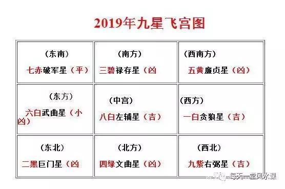 一白水星居坎宫,二黑土星居坤宫,三碧木星居震宫、四绿木星居巽宫,五黄土星居中宫,六白金星居乾宫,七赤金星居兑宫,八白土星居艮宫,九紫火星居离宫。以上为九星本来所居宫位,但随着年、月、日、时会不断变换。九星中,属于紫、白者为吉,属于碧、绿、黄、黑者为凶。