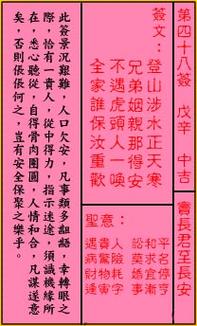 抽签48签的吉凶含义很多,既有好兆头,也有坏兆头。以下是几个典型的吉凶含义: