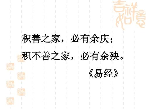“积善之家必有余庆”,这是易经中的名言,也是我们中华民族的智慧。它告诉我们,积攒善行,就一定会得到回报。然而,要让家庭得到“余庆”,需要我们付出才能得到。积善可以提升一个人的道德水平、增加社会认可、增强自信心,最终实现个人价值的提升。