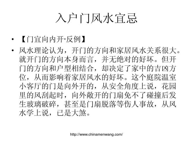 门是家居风水中所必不可少的设施,而从风水命理的角度有门就有吉凶,一般情况下,认为开乾门(西北门)、兑门(正西门)、离门(正南门)、艮门(东北门)为吉,而开震门(正东门)、巽门(东南门)、坎门(正北门)、坤门(西南门)为吉,其主要是根据先天八卦图和阴阳平衡原理判定的。