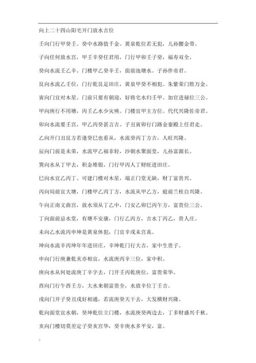 阳宅院出水口1在风水阳宅学术中,大厅外的水和院子里的水是不同的。大厅外的水往往是指阳宅外的水流,即阳宅外的大厅出水口。院子里的水是指院子外的水流出的地方。如果下大雨,屋檐下的水会滴在院子里,院子里的水流出的地方就是院子里的水流方向。