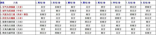 八宅按后天八卦分为九宫:1、北宫:坎(水);2、西南宫:坤(土);3、东宫:震(木);4、东南宫:浔(木);5、中宫:男坤女艮(土);6、西北宫:乾(金);7、西宫:兑(金);8、东北宫:根(土);9、南宫:离(火);吉:生气(旺丁,大吉),天医(财位,大吉),延年(加寿,大吉),伏位(平和,不凶吉),凶位:绝命(大凶),五鬼(大凶),六邪(次凶),祸害(小凶)。