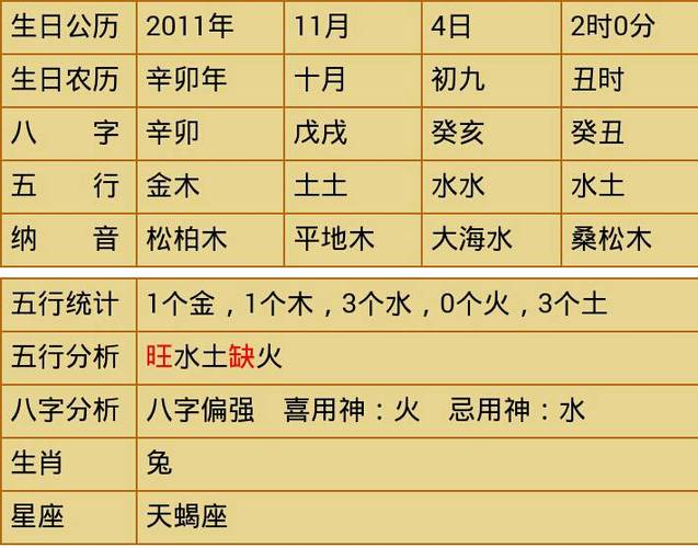 一个人的八字是由年干支、月干支、日干支、时干支构成的。也就是说由四个天干,四个地支构成。而每个天干和地支都有对应的五行属性(指的金、木、水、火、土)。