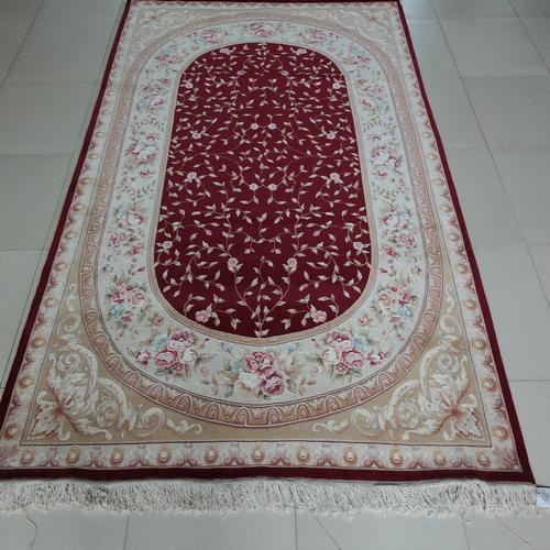 手工地毯的图案都是通过手工打结的方式编织而成的。手工打结就是织毯的方法,我们一般采用八字扣的方法织毯,编织的时候,在前后两根经线组成的一个经头上,打一个“8”字形的扣,将毯纱栓在经线上,并用刀砍断纱线,在地毯表面形成一个小绒头,也叫做栓头。织工们沿着纬线逐个经头打结,打完一排,然后由前后两对经线间过一根横向的纬线,再用耙子砸平,再沿前后经外缘过一根横向纬线并砸实。最后用剪刀将毯面的线头剪齐,至此就编织完了一道,整块地毯就只是这样一道道编织而成的。