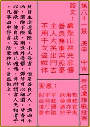 这种占卜龙门得遇的形象,凡事都变大了。这个签家祈福,自己祈福,求财秋冬吉,交易迟到,结婚,寻人见,诉讼合理,六甲女,行人祈福,田蚕中平,六畜中平,移民守旧,失物东方,病安,山坟吉祥。