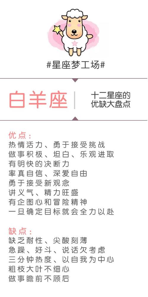 白羊座3月21日-------4月19日充满希望、和蔼可亲、行动力、活力充沛、诚心诚意、天生长才、勇敢