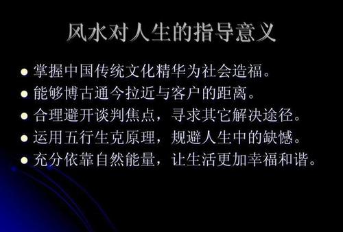 郑博士常说:风水让我们对周围的事情讲究起来了。我们只有注意自己周边的风水,如住宅、办公室、接触的人和事等等,才能有的放矢,才能化险为夷,才能将自己的运势挥洒出来。否则,就如同郑博士在文章里说的那位上海商人到了丽江,住了三天,带回来一身的晦气;也容易出现郑博士说的那位中国某大集团总裁到日本谈判,被日本商人“阴”了去、损失惨重。