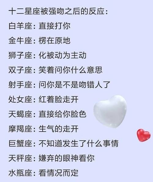 在偶像剧中,我们都看过很多强吻的场景,结局可能是接吻的答案,也可能是一记耳光。在现实生活中,一些朋友可能也有过强吻或强吻的经历,那么十二星座被强吻会有什么反应呢?