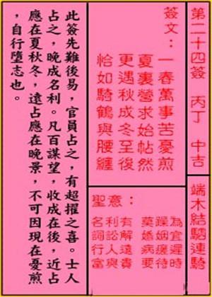 通过对24灵签的介绍和分析,可以看出它是一种深刻的占卜和祈祷文化,其系统和方法博大精深,适应性和灵活性广泛。24灵签不仅是一种神秘的数学方法,也是一种深刻的哲学思想和文化遗产。在现代生活中,24个精神标志仍然具有重要的意义和价值。它不仅可以帮助我们预测未来,回答问题,还可以让我们更深入地理解自己和生活的真正意义。