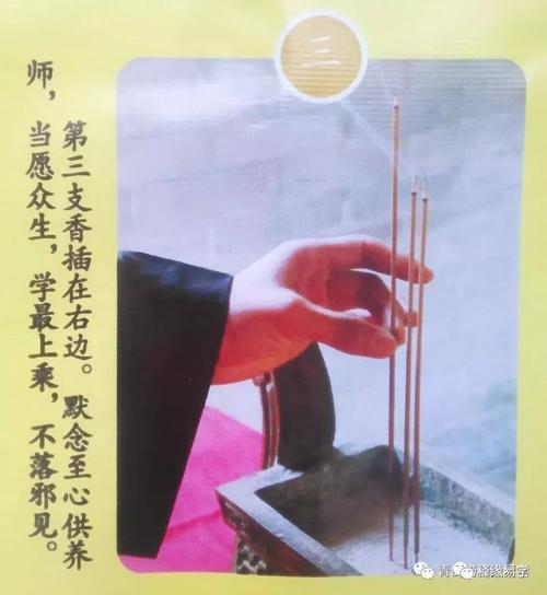 6、开始用左手插入。第一支香插在中间,插入时默念:“供养十方三世三宝。”第二支香插在右边,插入时默念“供养有经验的父母和老师”。第三支香插在左边,插入时默念:“供养十方法界的所有众生和我的债务。”