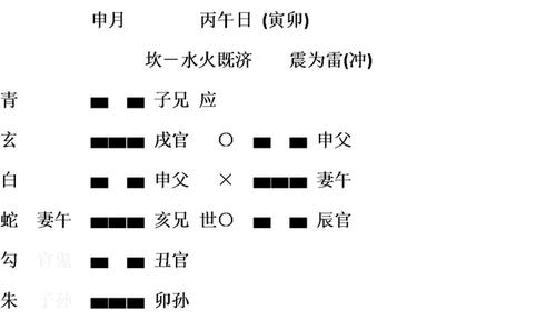 预测日天干为丙或丁,从初卦到六卦六神的顺序是朱雀、勾陈、蛇、白虎、玄武、青龙;
