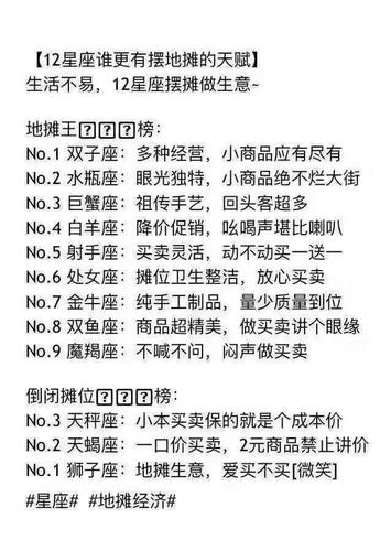 摆地摊虽然看起来简单,但要做好还是需要花费很多精力和心血的。不同星座的人有不同的特点和优势,只有找到自己的定位和市场缺口,才能够在激烈的商业竞争中取得胜利。希望以上的介绍和建议对您有所帮助,愿您在摆地摊的道路上越走越远,越摆越好!