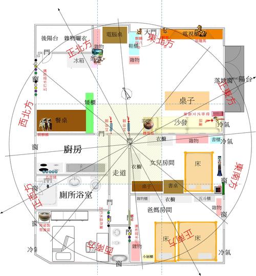风水方向:遵循“龙”、“虎”、“鸟”、“蛇”等方向,合理规划整个住宅的门窗位置、家具摆放、人员活动区等,使生活环境与自然环境相协调。