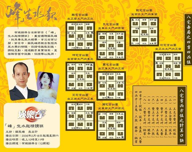 八卦:八卦图共分先天八卦及后天八卦两种。八卦图共分两种,一种名为先天八卦,又名伏羲八卦,相传为伏羲氏的创作,据说此八卦乃太极图的演化。另一种则是后天八卦,双名文王八卦,相传是周文五的创作。八卦为乾、坤、震、巽、离、坎、艮、兑。先天八卦与后天八卦的排列、象徵方位及所象徵的数,都有所不同。先天八卦的所主是:1乾居南方,数目为一,与坤相对。2坤居北方,数目为八,与乾相对。3震居东北,数目为四,与巽相对。4巽居西南,数目为五,与震相对。5离居东方,数目为三,与坎相对。6坎居西方,数目为六,与离相对。7艮居西北,数目为七,与兑相对。8兑居东南,数目为二,与艮相对。以上各相对的数字合,便为九,乾与坤合为九,震与巽合为九,离与坎合为九,艮与兑相合亦为九。后天八卦与先天八卦所主的有异:1离居南方,五行为火,数目为九,与坎相对。2坎居北方,五行为水,数目为一,与离相对。3震居东方,五行为木,数目为三,与兑相对。4兑居西方,五行为金,数目为七,与震相对。5乾居西北,五行为金,数目为六,与巽相对。6巽居东南,五行为木,数目为四,与乾相对。7坤居西南,五行为土,数目为二,与艮相对。8艮居东北,五行为土,数目为八,与坤相对。八宅风水学所取的卦为后天八卦,此八卦中的每一卦皆主一位六亲:乾主父亲,坤主母亲,震主长男,巽主长女,坎主中男,离主中女,艮主少男,兑主少女。当家宅内某一方位不吉时,我们可根据该方位的卦,推断其不吉对谁的影响最大,同样道理,哪一方最吉,亦可据此方位的卦推断谁获益最大。