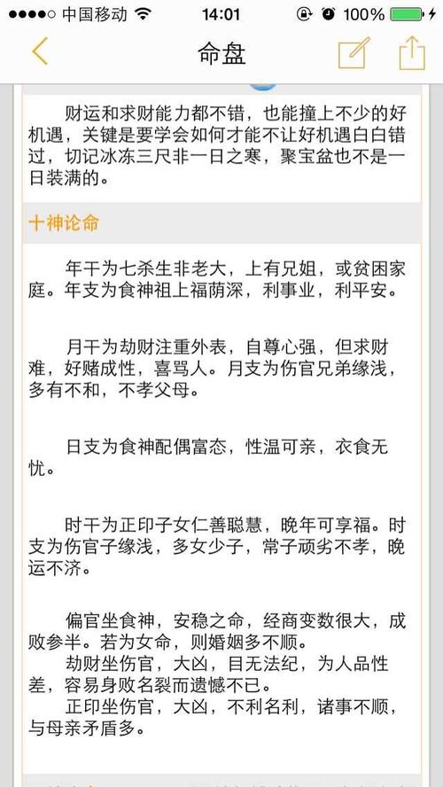 正印格男与食神格女在阴阳上非常平衡,能够构成食神生财之势,便为食神生财格。比如男命局:壬寅、己酉、己巳、甲戌大运:庚戌、辛亥、壬子、癸丑、甲寅、乙卯。此命局日主己土,月令酉金食神,与日支已半合成局,年干透正财,身强成食神生财之势。大运财地,做金属生意而发财,生意很大。食神配印研究命理的人都知道,伤官配印为上格,食神与印星搭配得宜也可成上格。一般食神配正印为上,因正印与食神阴阳相异。