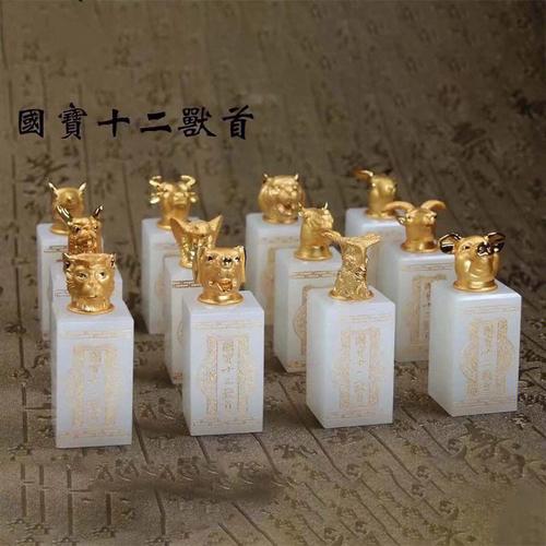 国宝圆明园十二兽首金玉玺以圆明园十二兽首为原型创作,全套共12尊,每尊宝玺均以和田青玉为玺基,玺基尺寸为56mm某56mm某96mm,取意中国的56个民族及960万平方公里的领土面积之意,力图使这一造型吉祥的圆明园“皇家守护神”成为现代所有中国人的守护之神。