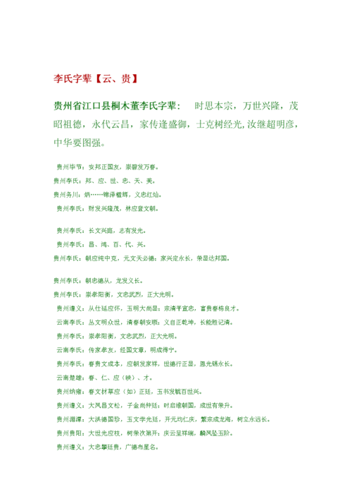 李姓家族,辈序是"元、美、光、先、绪、敦、修、大、守、成、广、传、家、仕、本、唯、学、可、长、荣”。李姓家谱李姓族谱种类繁多,数量惊人,据说美国犹他家州谱学会存有115种,北京图书馆收藏有67种,民间保存者不计其数。从时间上说,李姓族谱始于宋代,盛于明、清,还有一些是近现代的,基本上都是私修,而且有初修、续修、再修等版本。修谱的主要目的是“尊祖收族”,并对宗族成员进行“尊尊亲亲之道”的伦理教育,也就是尊敬祖先,加强宗族团结,明确怎样为人处事。族谱的主要内容是记载李姓世系(即世代相传的统系)和重要人物的事迹,一般前有序文、凡例,后记祠堂、祖茔、辈分、族规、家训等。序文李姓起源、分支始祖、本谱编修宗旨等。北宋景佑二年(1035年)王曾、欧阳修分别为《李氏族谱》写的序说:“皋陶大理氏支孙征,相夏,避难于长安李树坡,指李为姓……”“先大孺人系出金陵李氏……我李氏自陇西公、唐公、临淮王光弼、陇西郡火德以来,王侯、尚书、宰相一时贵显,世英与伦;其后,暂经离乱、迁徙不一,由金陵、桂陵、西蜀、长安、长沙、洪州、吉安、抚州、福建、广东、云南,莫非金陵之派……闻谱之为制,所以别世系、辨尊亲而教爱之道存焉。”“凡例”说明本谱的体例及收录范围。例如,文川(今福建省连城县蓬峰镇)《李氏七修族谱》有这样一些记载:“族谱横图所以明世次也,故每为一世为一层,条系于名下或一子至几子而止,等而下之至五世为一截,又起而系六世,等而下之至十世为一截,自后十一世至数十世,俱照此式”;“横图书法先大书名讳,旁行细字分书某之几子,次书字、书号及行履历、生卒年月、配某氏、或继娶某氏,俱书生卒及葬所”;“凡字号、行配、生卒、葬所、年月,考实则书,无考则阙”;“凡本族先世仕有清节雅望者,必详传其爵位、功德,未仕而有学行事功,可为世法者,亦传其实”;“妇有美行及苦节可称者,亦各为书”。祠堂、祖茔,有文字叙述,还配有图。李姓辈分排列有序,用字讲究,为了便于记诵,大都编成诗、联。例如,清道光《李氏宗谱》列李金脉派的辈次为:“荣升芳建定,万代承宗明;世时乾坤太,子文应必兴”;清光绪《陇西郡李氏族谱》列李观脉派班次(班列的次序)为:“绍祖隆先泽,道德传家良;学士登魁首,荣华万载香”;“光宗思继述,世代发籍长;久远绵祖德,永赖振纲常”。这些诗、联,按先后顺序拆开的每一个字,就是这一脉派下传若干代每一代的字辈。