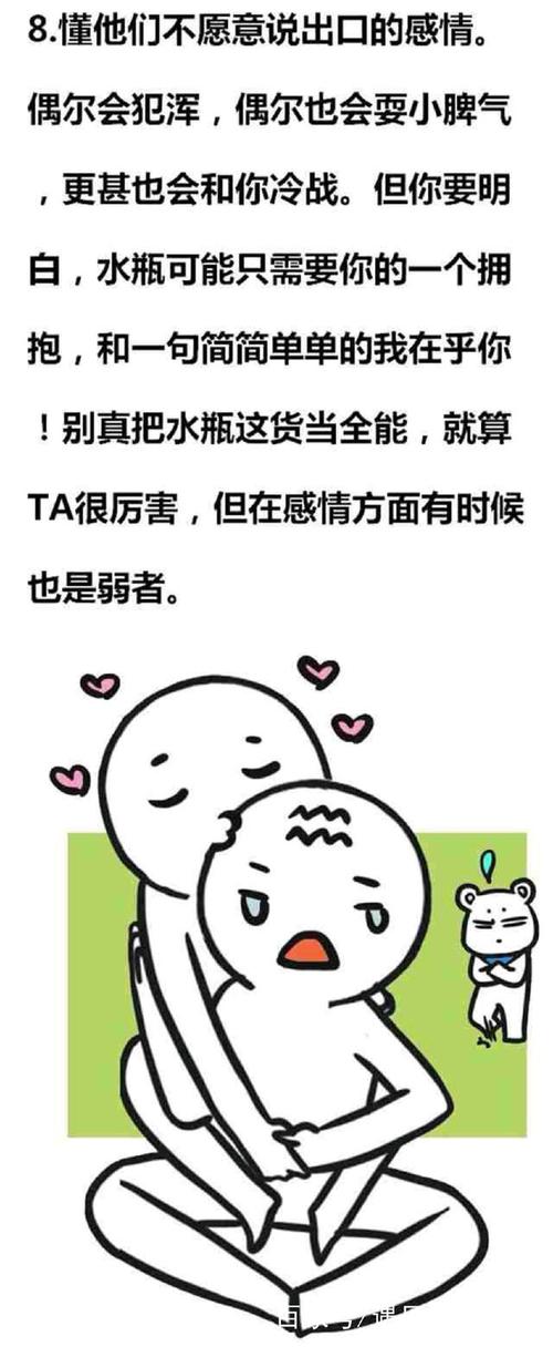 水瓶男还会在哄女朋友的情况下留心眼,不可以让女朋友培养这样的习惯,他们也会用哄的形式来女友明白那样没有好处,很影响她们之间的情感,为何非要娇情来要他的宠爱,本来平常他便能给你,或是积极主动的,一点都不会对身体有害,你负责享有就行了,水瓶男觉得宠女朋友理所应当,没有怨言,就是为了宠到她以后离不了自身,他人都受不了的程度就行了。