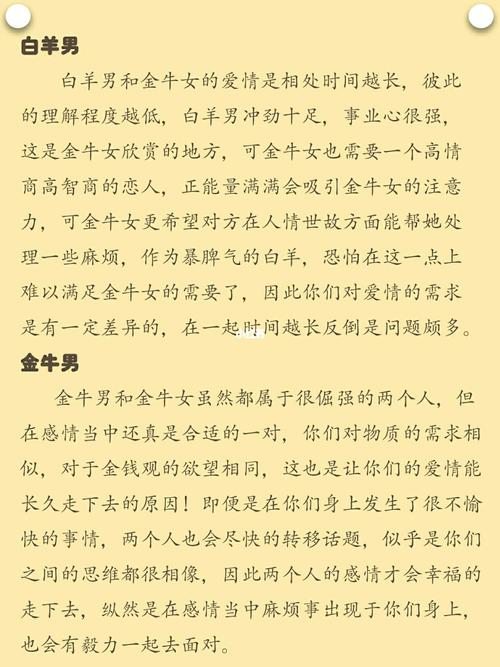 不太适合的星座:水瓶座水瓶座和金牛座并不是非常匹配的组合,他们的生活态度和价值观往往是相反的。金牛女喜欢安稳和舒适的生活,重视稳定和安全感。而水瓶座的人则倾向于追求自由和冒险。他们的人生观和金牛女大相径庭,不容易产生共鸣,在一起很容易产生矛盾。