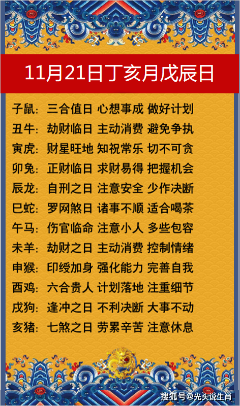 农历日期:农历二零二一年十月十七号,辛丑年十月十七日公历日期:公历2021年11月21日星期日干支历:辛丑年己亥月癸酉日今日五行:剑锋金今天周几:星期值日星神:朱雀(凶星)执位:开日宜:诸事不宜忌:诸事不宜冲:冲兔(丁卯)煞东今日胎神占方:房床门外西南吉神宜趋:圣心生气母仓时阳除神鸣犬凶神宜忌:五离灾煞天火朱雀彭祖百忌:癸不词讼理弱敌强酉不宴客醉坐颠狂