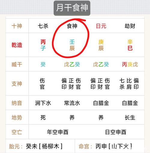 (2)神煞:食神坐空亡,其福不足,且子息少:食神坐羊刃,多劳苦;坐沐浴桃花,子女多风流;坐驿马,子女远行’长大成人后不会生活在父母身边;坐天乙、文昌等吉神,子女聪敏有智慧。