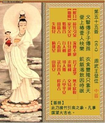 灵签之曰:本签为松柏之岁寒者。任何之树木枯之后。仍挺具秀者。各面均呈祥。当异日成大材老焉。是大器晚成型。惟不可因此满足。必须因此更加培植。事事积德。方可有更好之明日。要之。象征平地风光夙缘有定。丰熟田稻家获馀庆。交易-旺婚姻-成求财-顺利自身-顺利家宅-吉六畜-损田蚕-利寻人-至行人-有信六甲-生男山坟-吉讼词-有理疾病-安失物-见移徒-吉