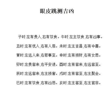 眼皮跳,各时辰皆不相同,其运难辨,而若有好运之意。