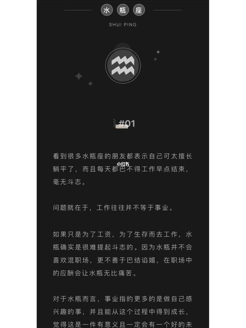 3.潜心专一水瓶座,是一个非常出色的星座。水瓶拥有很高的才能,人群中是很积极、闪耀的存有。无论在哪个行业,水瓶都能取得一定的小成就。对待感情,水瓶有自己的了解,水瓶座不善于烂漫,乃至也不喜欢说花言巧语。因为没经常说,因此当水瓶甜言蜜语时,便会魅力无穷。水瓶座性格比较直接,会告诉对方自身喜欢什么东西,不喜欢什么。水瓶只愿意给自己在意的人投入,不在意他是不是给自己付出多少。如果两个人投入的天平不均衡,差太多了,水瓶心里就会逐渐斤斤计较。水瓶座的恋爱,始终是潜心且专一的,只要是你水瓶看中的人,就永远会不弃不离。