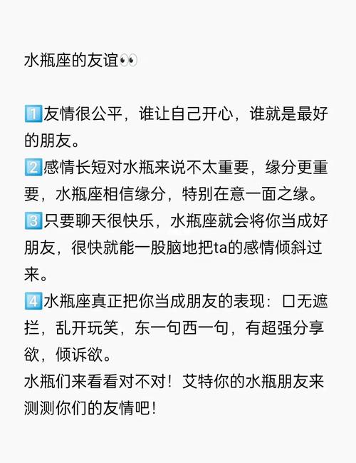 水瓶座对真正的好朋友3很多人会认为水瓶座没有足够的情商,他们总是不会向别人展示自己的情绪。虽然他们不会和别人闹翻,但他们不会和别人有多亲密