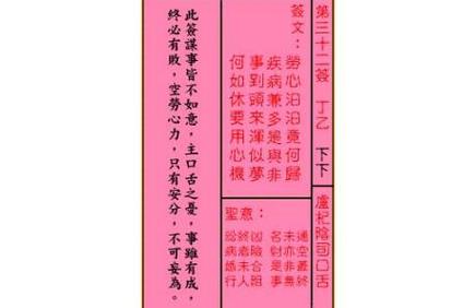 【解说】这个签家很不安。我们必须防止人们的舌头。怨恨就在门口(怨恨是孝顺的眼睛。意思不明)。财富有失。每个高尚的人都会总结一下,以保护自己。逐渐繁荣。多说话。问婚姻诉讼。疾病是惊人的。财产消失了。名利空虚。只适合保守。不利于远行。防止亲属侵犯。