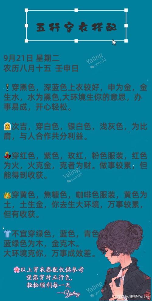 ①吉,宜穿黑色、蓝色、深灰。申为金,金生水,水为黑色、蓝色、深灰。与当日五行相生,为贵人色,即大环境生你的意思,乃大旺之像,易招贵人,易获扶助,可直接产生好运势!轻松开心,诸事易成。