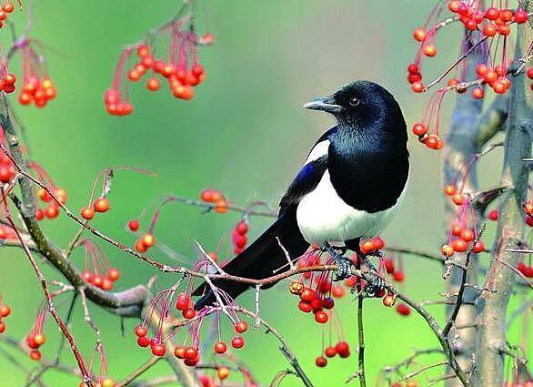 喜鹊是传统文化中的吉祥鸟之一,被认为是代表着好运和吉祥的象征。在古代的传说中,喜鹊曾经为一位病人带来了救命草,并且在破晓时鸣叫,使得病人获得了重生。因此,人们常常把喜鹊看做是一种神奇的生物,同时也被认为是带来吉祥和好运的使者。